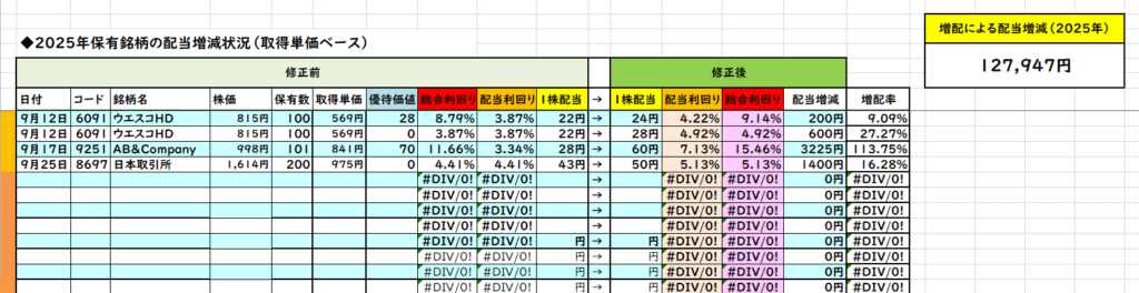 今月は増配3社、減配0社で差し引きの配当は「5,425円」増加しました。そのため、今年保有株の増配によって増えた配当は「+127,947円」となります。2024年に保有株の増配によって増えた配当は「+81,353円」なので2024年~2025年で保有株の増配によって増えた配当は累計「209,300」と20万円の大台を突破しました。この金額はとても大きく、仮に同等の配当を新規投資によって得ようとすると元本は「約523万円」必要となります。これは新NISA枠で利回り4%想定で仮定した場合なので、特定口座や現在の市場の利回りを現実的に考えると「投資元本は657万円程度」に匹敵するので増配の威力はとても大きいですね。なお、前期配当の増加分も含んでいるので単純に配当が累計で「209,300円」増えたという訳ではないですがとても大きい金額です。(なお、ウエスコHDは優待廃止と株価急騰に伴い売却しているので来期分の増配分は幻となりました。)
