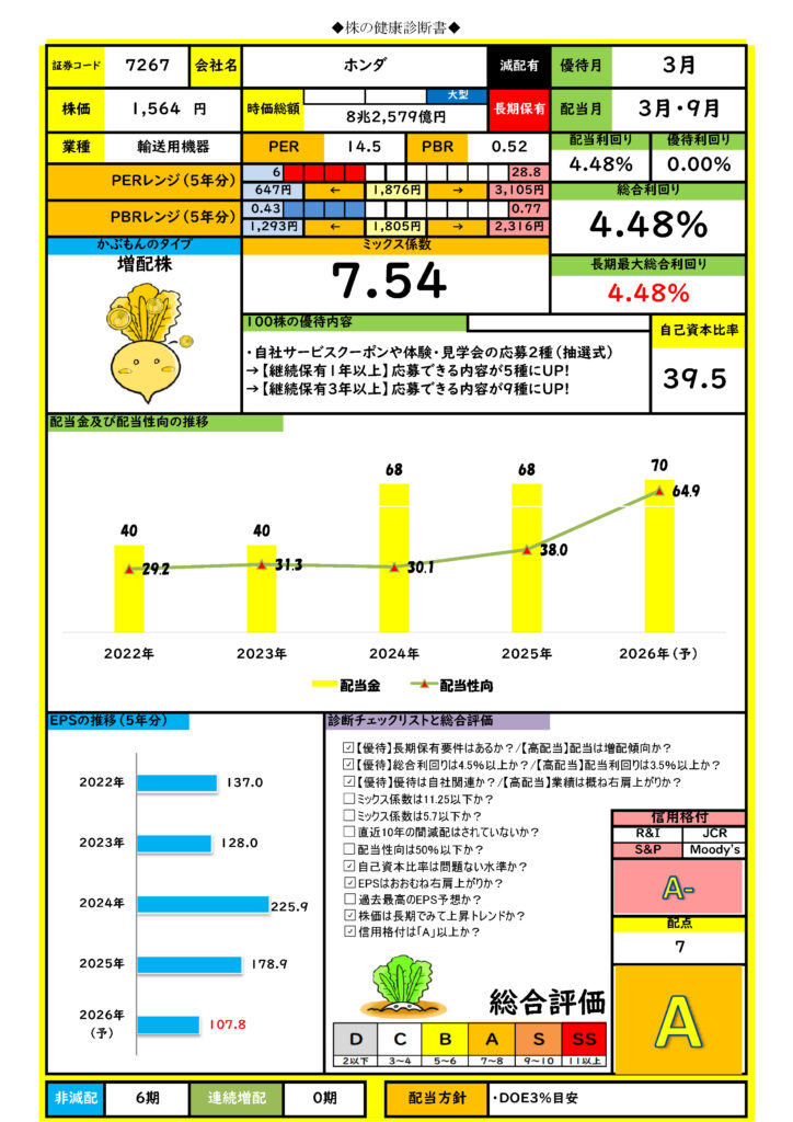 そんなホンダの指標を「株の健康診断書」で見てみましょう。