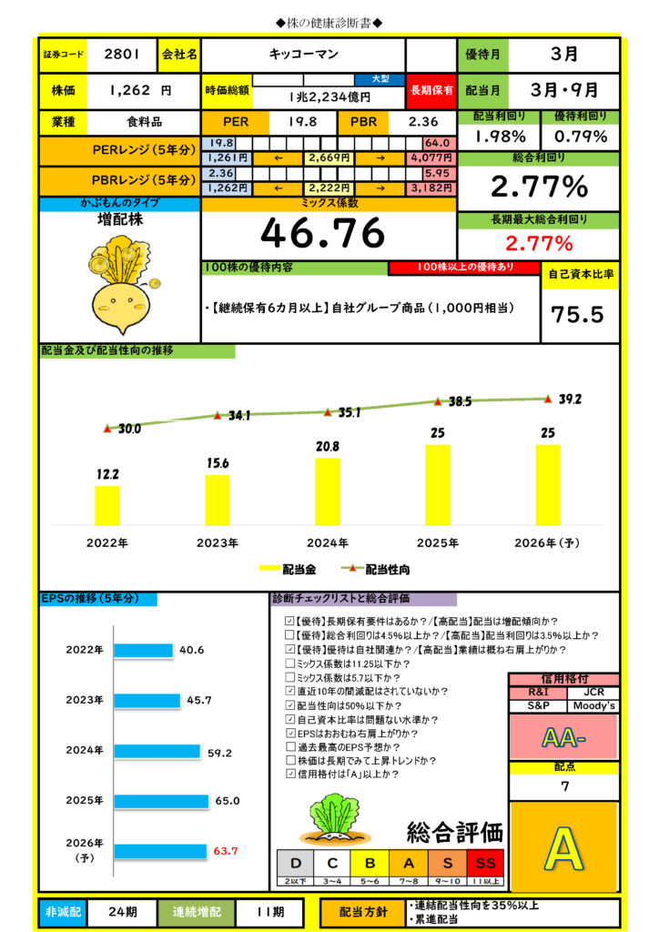 そんなキッコーマンの指標を「株の健康診断書」で見てみましょう。
