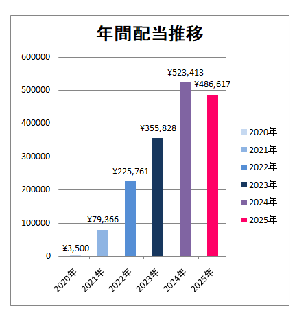 2025年の税引き後の年間受取配当金は486,617円となりました。自身は投資歴6年目の平均年収程度のサラリーマンですが、「入金の継続、企業の増配、配当金の再投資」という3つのエンジンの相乗効果の大きさを実感しつつあります