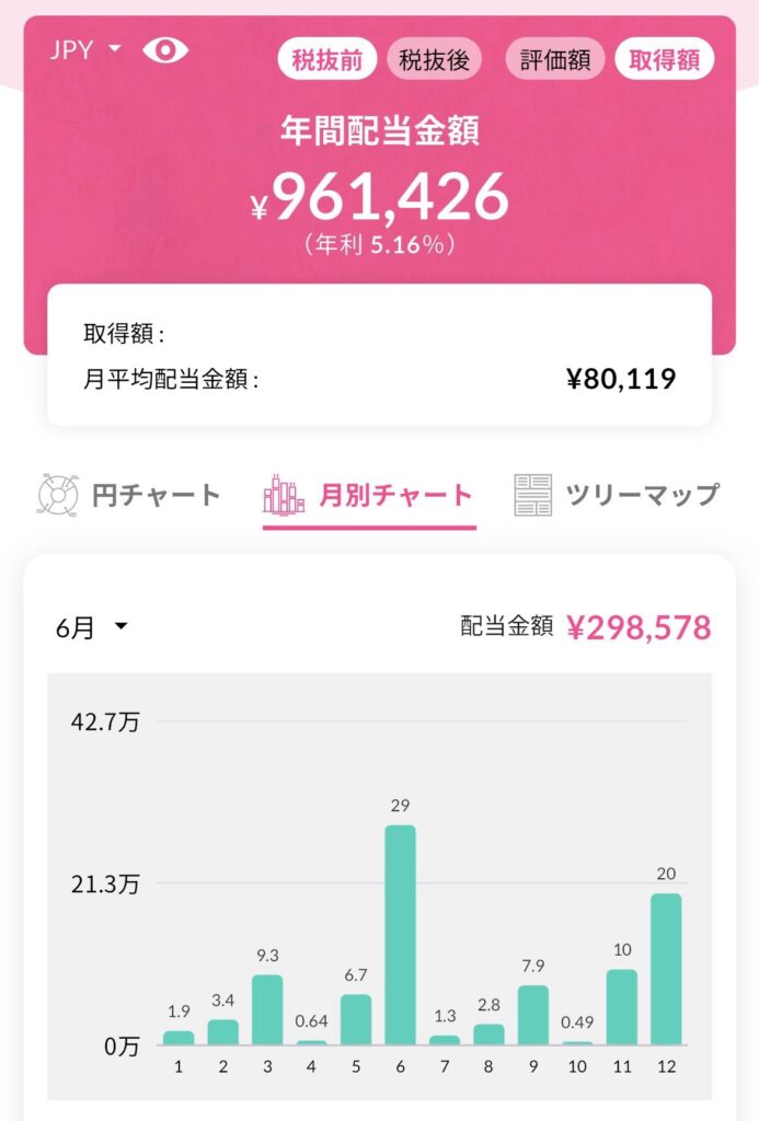 最後に今月末時点での年間配当です。税引き前が96万円、税引き後が80万円となっています。