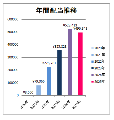 2025年の税引き後の年間受取配当金は496,843円となりました。自身は投資歴6年目の平均年収程度のサラリーマンですが、「入金の継続、企業の増配、配当金の再投資」という3つのエンジンの相乗効果の大きさを実感しつつあります