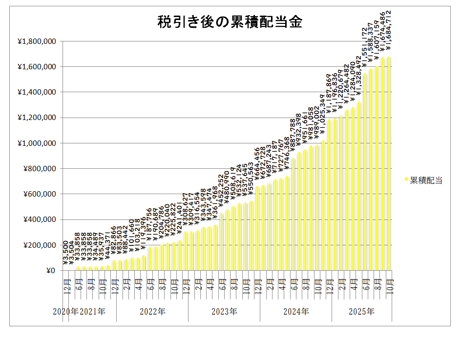 また、投資開始以来の税引き後の累計受取配当額は「1,684,712円」と「168万円」を突破しました。