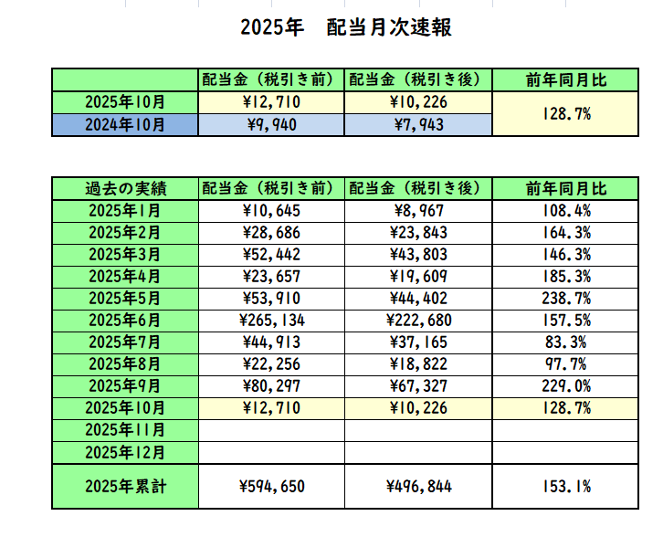 昨年10月の税引き後の受取配当は7,943円でしたが、今年10月の税引き後の受取配当は10,226円前年同月比で「128.7%」(約1.29倍)と増加しています。