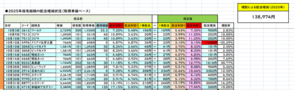 今月の保有株の配当増減状況です。2024年より保有株が増配によってどれだけ配当を増やしてくれたのかというログをここでは実験的に残しています。