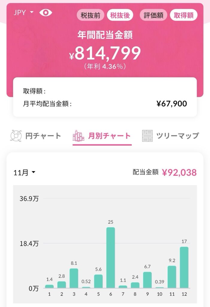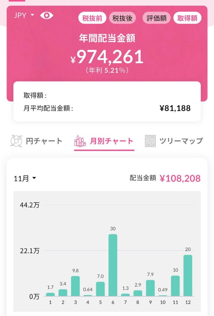 最後に今月末時点での年間配当です。税引き前が97.4万円、税引き後が81.4万円となっています。