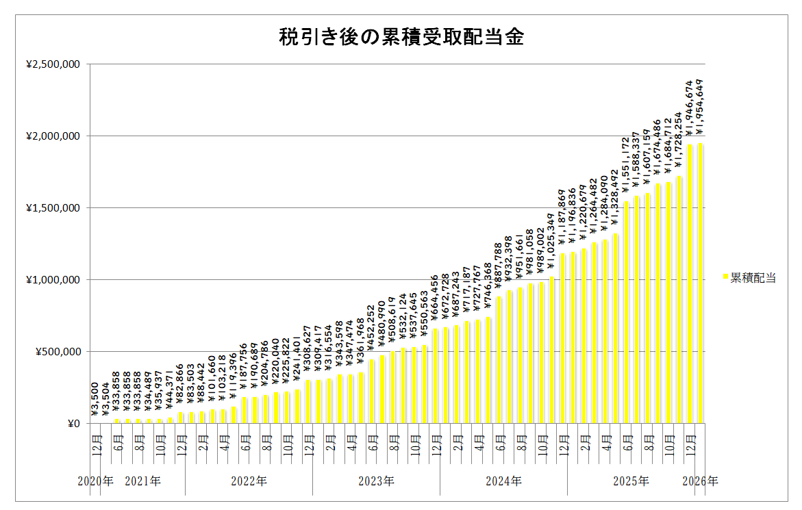 また、投資開始以来の税引き後の累計受取配当額は「1,954,649円」と「195万円」を突破しました。もうすぐ配当だけで「200万円も受け取ることができた」と考えるととても大きいですね。