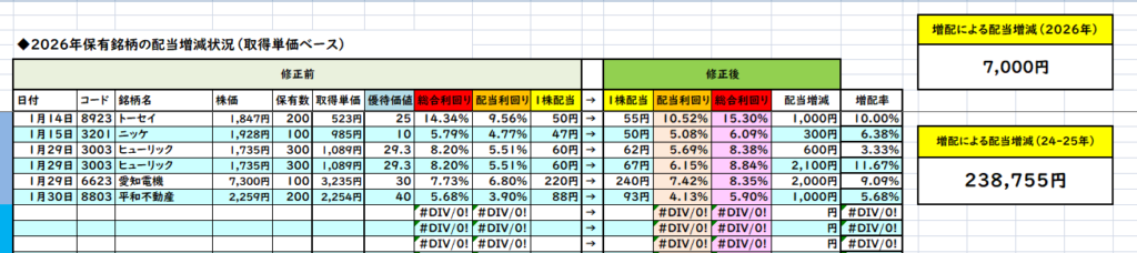 今月は増配5社、減配0社で差し引きの配当は「7,000円」増加しました。そのため、今年保有株の増配によって増えた配当は「+7,000円」となります。2024-25年に保有株の増配によって増えた配当は「+231,755円」なので2024年~2025年で保有株の増配によって増えた配当は累計「238,755円」と24万円を突破しました。この金額はとても大きく、仮に同等の配当を新規投資によって得ようとすると元本は「約597万円」必要となります。これは新NISA枠で利回り4%想定で仮定した場合なので、特定口座や現在の市場の利回りを現実的に考えると「投資元本は750万円程度」に匹敵するので増配の威力はとても大きいですね。なお、前期配当の増加分も含んでいるので単純に配当が累計で「238,755円」増えたという訳ではないですがとても大きい金額です。