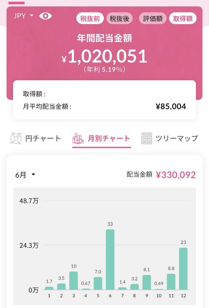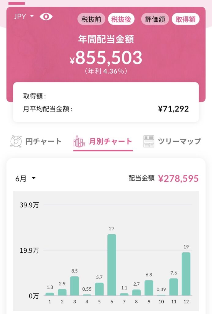 現在の税引き後配当は月平均7.1万円、株主優待と合わせた不労所得は月平均8.6万円程度となっており、今の自分の労働収入から考えるととても大きいです。所感としては少しずつながら着実に配当収入が積み上がってきて嬉しいなーと感じますね。