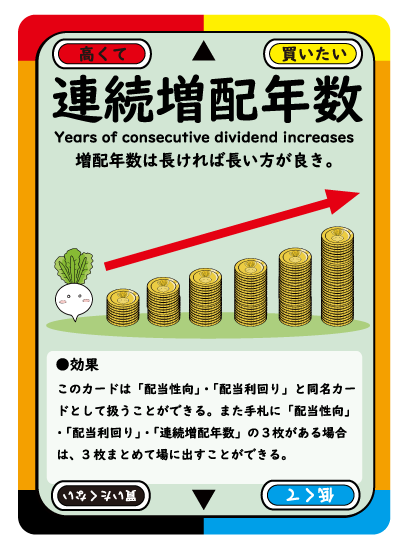 ・また「配当性向」・「配当利回り」・「連続増配年数」の3枚が手札にある場合は一気にまとめて手札を減らすことができますね。