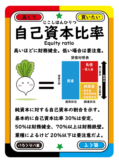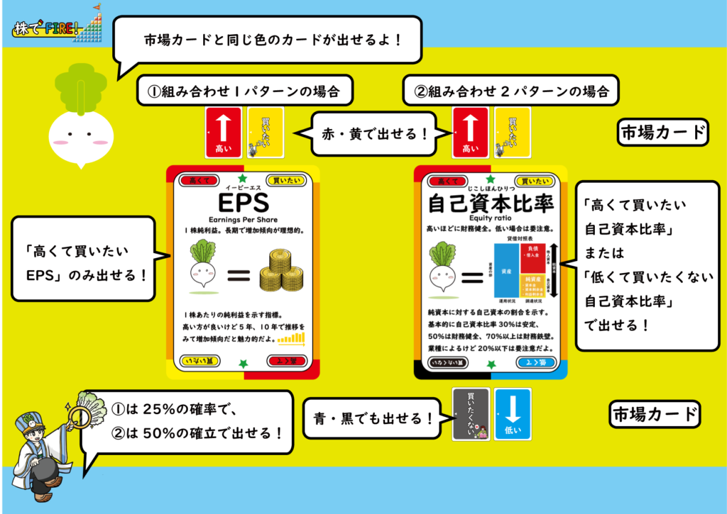 ・上下で色が違う場合はそれぞれ市場に応じて出すことができます。(【例】配当性向は市場カードが「低い(青色) / 買いたい(黄色)」または「高い(赤色) / 買いたくない(黒色)」の2パターンで出すことができます。