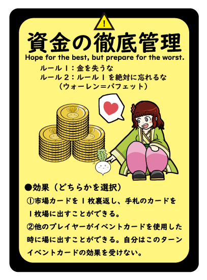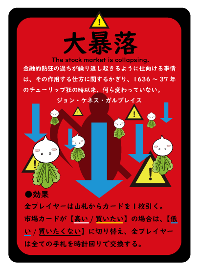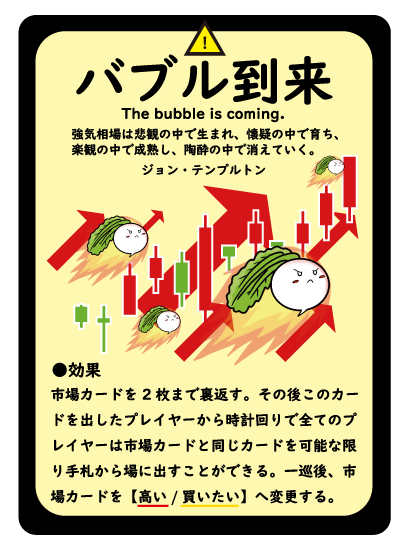 バブルと言えば指標に関係なく何でも上がる上昇相場です。このカードを使うことで市場カードを自分の好きな色に切り替えて、その市場と同じ色のカードを本イベントカードを使用したプレイヤーから順番に可能な限り手札から出すことができます。