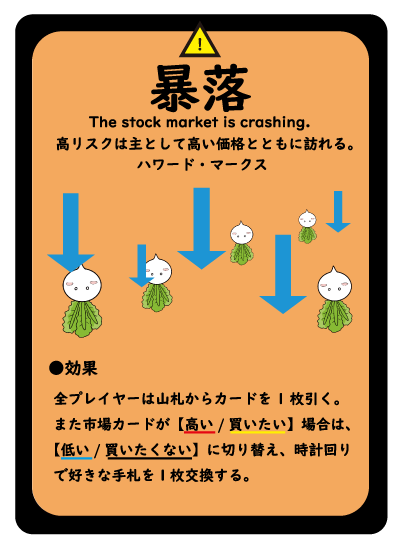 また市場カードが【高い(赤色)/買いたい(黄色)】の場合は大混乱によりすべての手札を時計回りで交換します。