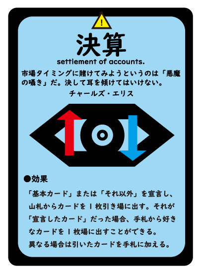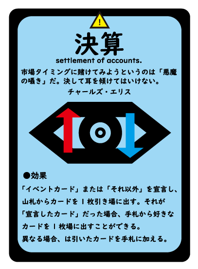 山札からカードを1枚引いて基本カード(★)かそれ以外(▲または⚠️)を当てます。まさに決算のドキドキを味わえるようなカードに仕上げています。