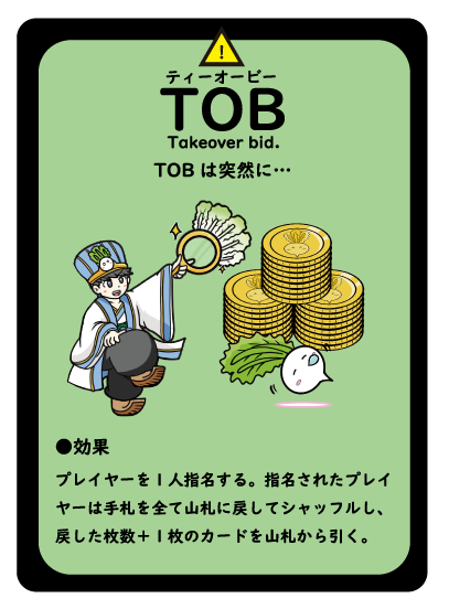 実際のTOBは基本的に株主にメリットのある効果になりますが、本イベントカードのモチーフは敵対的TOBの対象企業の合意を得ずに株式を取得し、経営権を掌握しようとする戦略とディスカウントTOBで安く買い取られる=資金が減る=手札が増えるというイメージで効果を作成しています。
