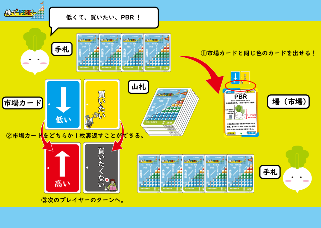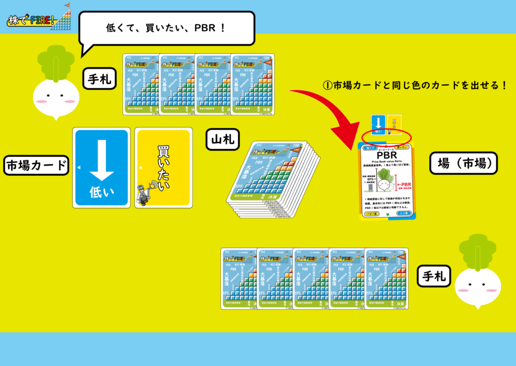 ②市場カードと同じカードまたはイベントカードを手札から場に出すことができます。例えば市場カードが(低い(青色) / 買いたい(黄色))であればイベントカードか、(低い(青色) / 買いたい(黄色))の基本カードまたは効果カードを出すことができます。なお、上下で色が異なる場合は上か下かのどちらかが(低い(青色) / 買いたい(黄色))であれば出すことができます。