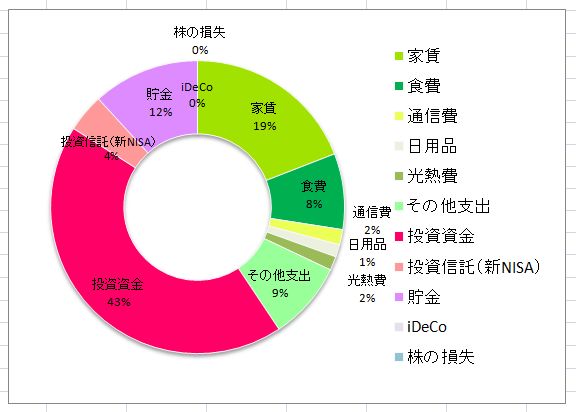 今月もなんとか目標範囲内で抑える事ができました。結果、「貯蓄・投資」に手取り収入の59.4%を振り分けられたことになります。