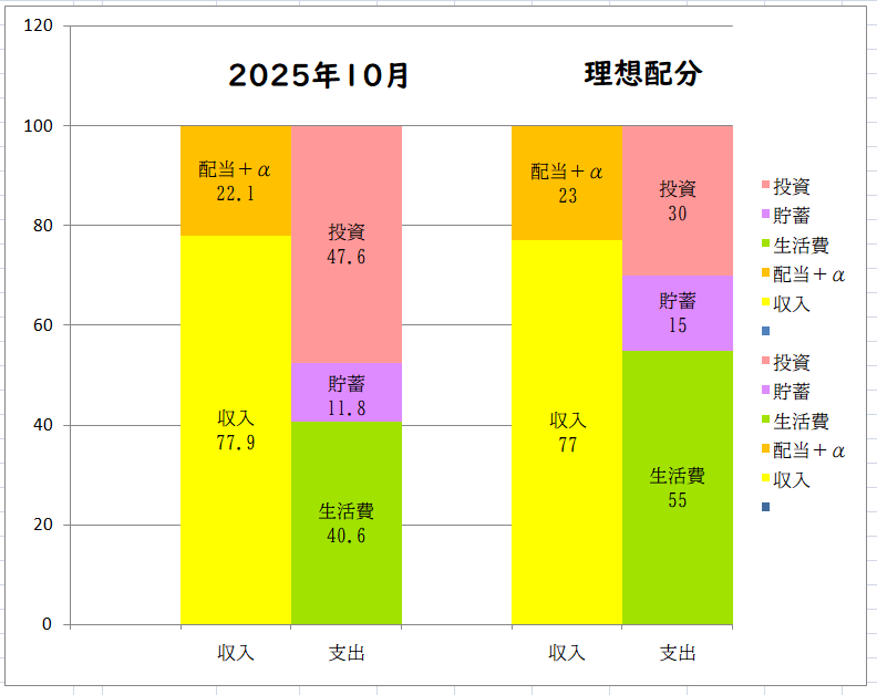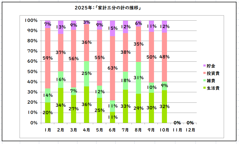 それでは早速、2025年10月の「家計三分の計(家計の内訳)」をみていきたいと思います。