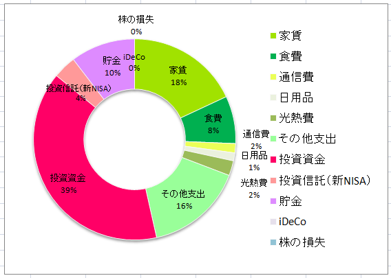 今月は収入の10.4%を貯金に、43.1%を投資資金に振り分けることができました。