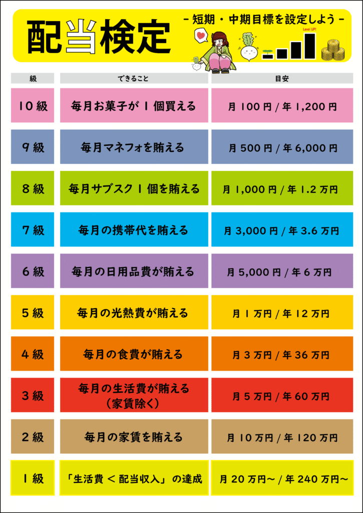 最初は少額の「配当金」であっても、継続していくことで少しずつ「電気代」や「ガス代」、「携帯代」、「日用品費」、「食費」などの生活費を賄えるようになり、新たな銘柄を購入する資金に充てることもできるようになります。短期・中期目標として配当検定を作っているので目標設定の参考になれば幸いです(^^)✨