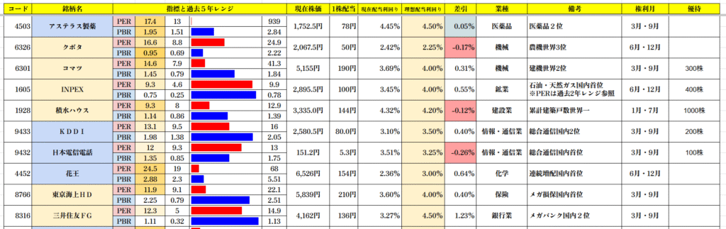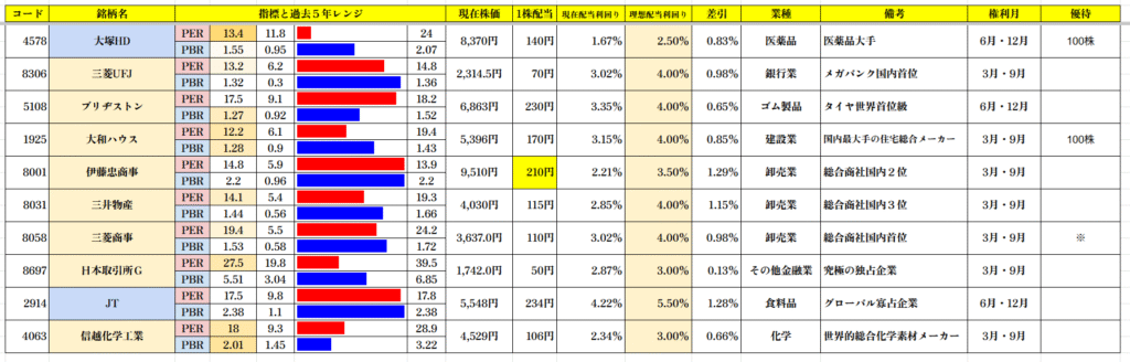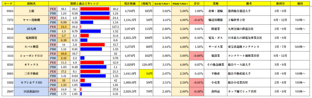 この中で理想配当利回り水準で推移している銘柄は0銘柄です。PER・PBRレンジで見ると全体的に割高寄りですね。(おかわりいただけただろうか。)
