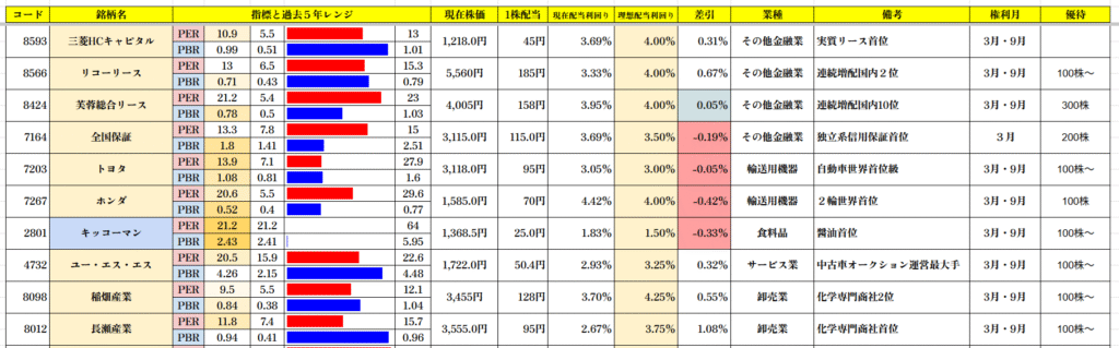 理想配当利回り付近の銘柄は芙蓉総合リース、全国保証、トヨタ、ホンダ、キッコーマンの5銘柄になります。