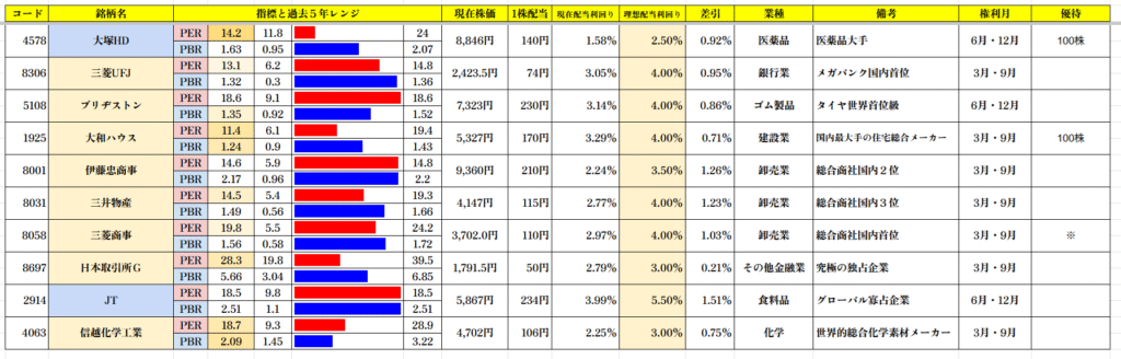 この中で理想配当利回り水準で推移している銘柄は0銘柄です。PER・PBRレンジで見ると全体的に割高寄りですね。(おかわりいただけただろうか。)その②はいつになれば理想配当利回りで買えるのだろうかと言う状況が続いています。でもきっといつかは買い時がくるのでそれまでの辛抱です。