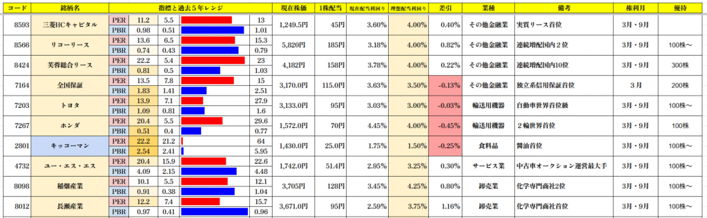 理想配当利回り付近の銘柄は全国保証、トヨタ、ホンダ、キッコーマンの4銘柄になります。
