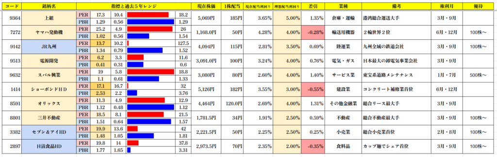 この中で理想配当利回り付近で推移している水準の銘柄はヤマハ発動機、ショーボンドHD、日清食品HDの3銘柄です。