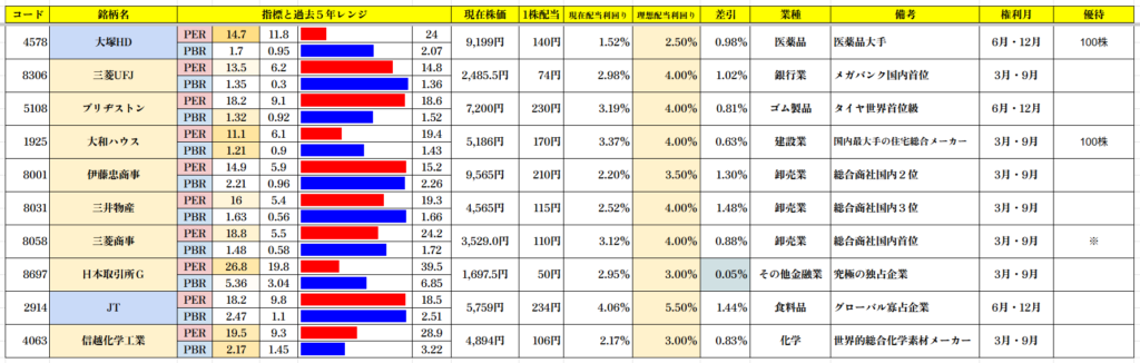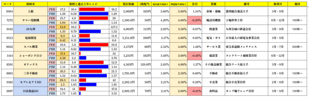 この中で理想配当利回り付近で推移している水準の銘柄はヤマハ発動機、ショーボンドHD、日清食品HDの3銘柄です。