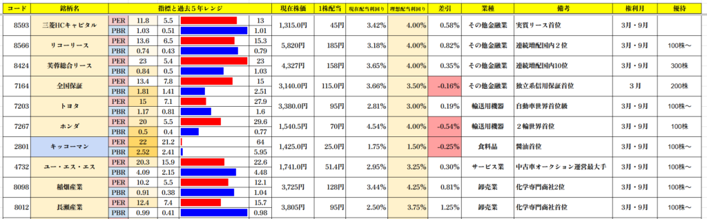 理想配当利回り付近の銘柄は全国保証、ホンダ、キッコーマンの4銘柄になります。
