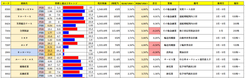 理想配当利回り付近の銘柄は全国保証、ホンダ、キッコーマンの3銘柄になります。