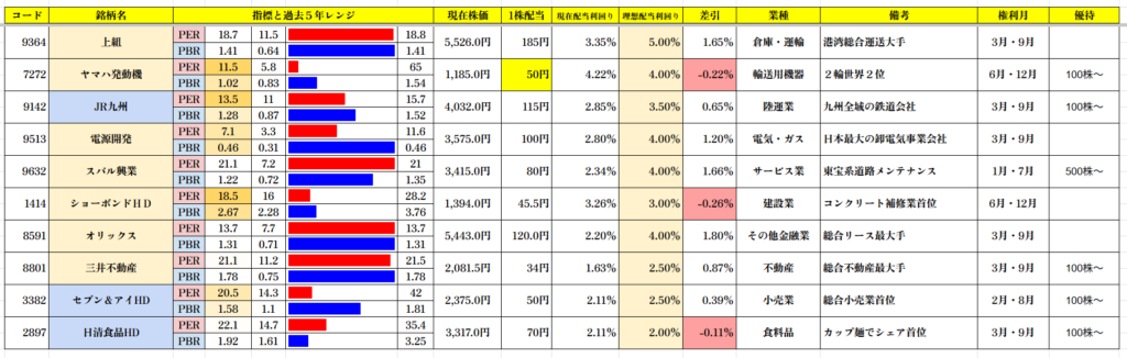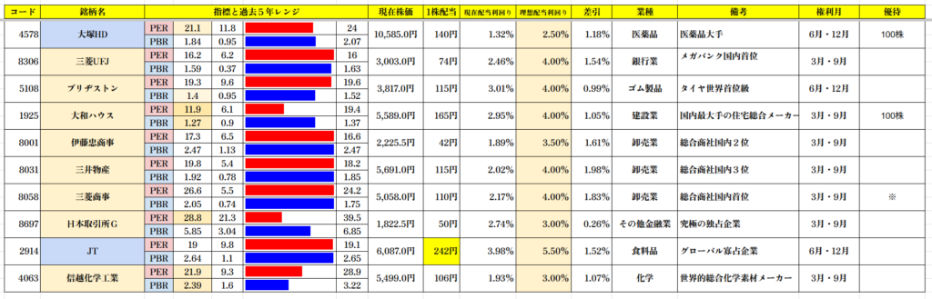 この中で理想配当利回り水準で推移している銘柄は0銘柄です。