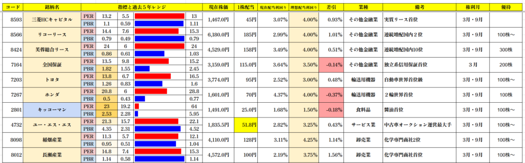 理想配当利回り付近の銘柄は全国保証、ホンダ、キッコーマンの3銘柄になります。