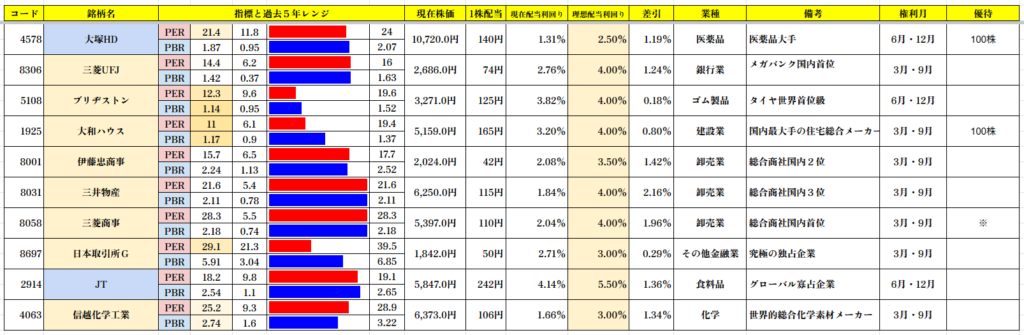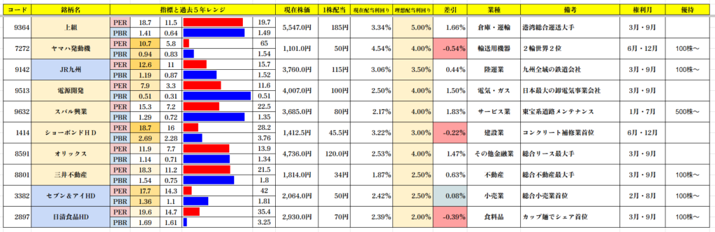 この中で理想配当利回り水準で推移している銘柄は0銘柄です。