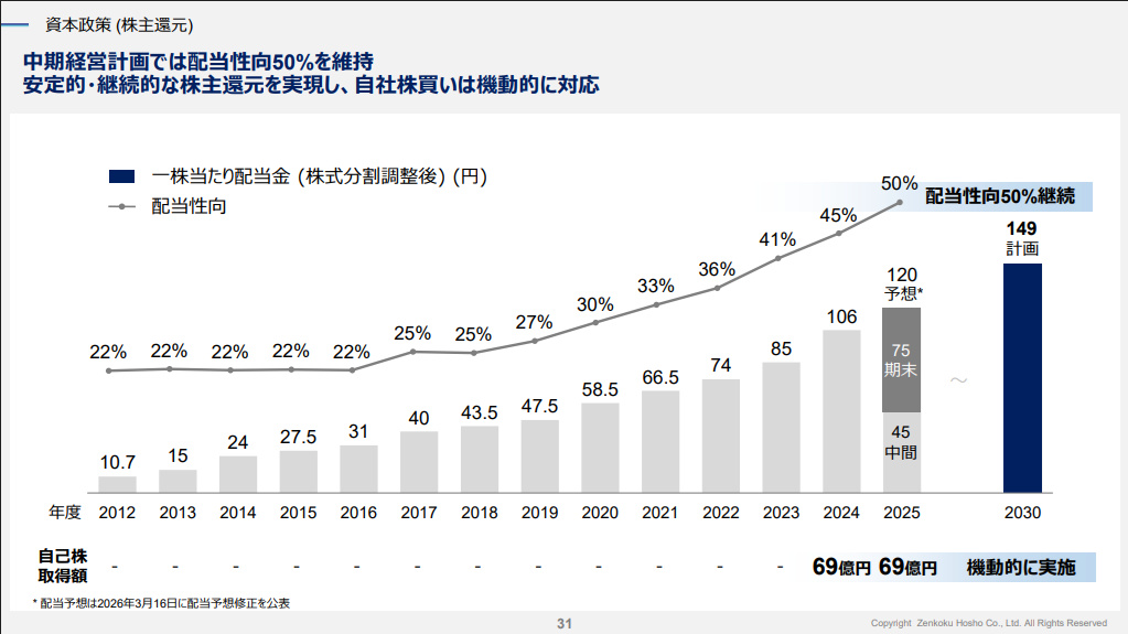 全国保証は上方修正と増配を発表し今期配当を115円→120円へ5円増配となりました。配当利回り約3.8%程度確保できます。当初の目標である121.5円にはやや届いていませんが本決算の増配を期待したいですね。また今年を最後に優待を廃止されますが、総合利回りも4.6%程度あるので連続増配銘柄としては中々美味しい利回りだと思いますね。新中計も出ているので来期以降の配当を想定しながら投資を検討するのも一手ですよ。(現在200株)