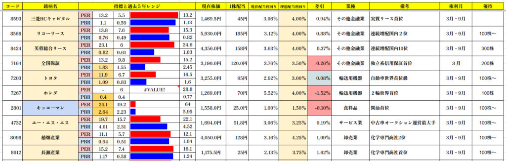 理想配当利回り付近の銘柄は全国保証、トヨタ、ホンダ、キッコーマンの3銘柄になります。