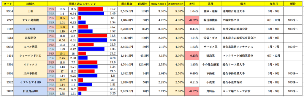 この中で理想配当利回り付近で推移している水準の銘柄はヤマハ発動機、ショーボンドHD、日清食品HDの3銘柄です。