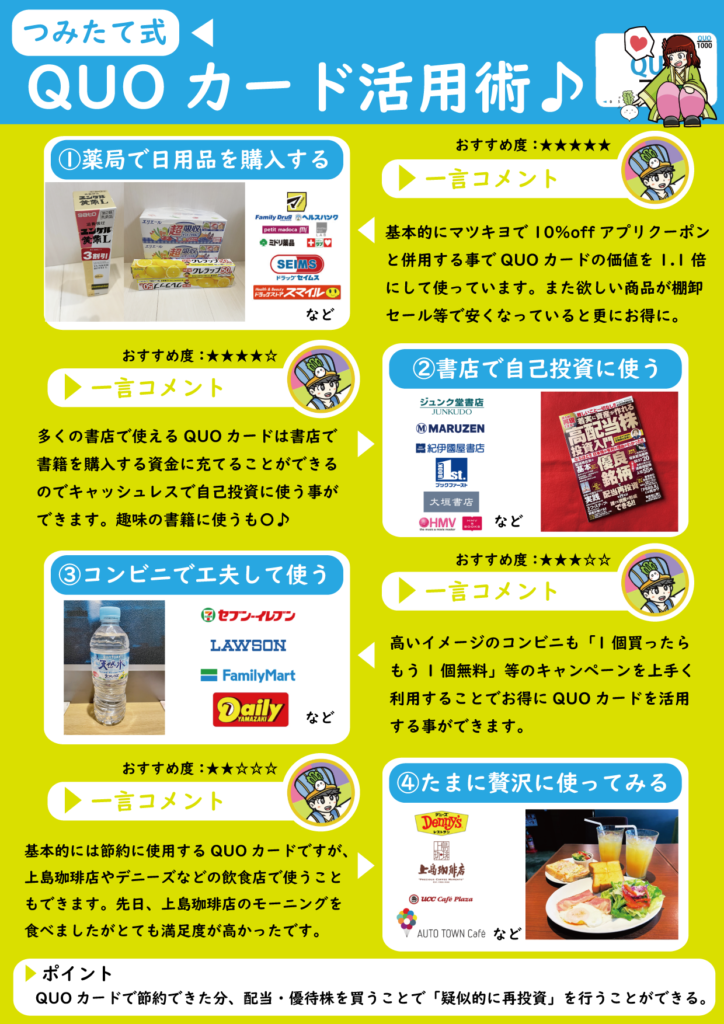 優待株を保有していると遭遇することも多い「QUOカード」。使えるお店も様々あり、いろんな使い方をすることができます。今回は定番の使い方から少しマニアックな使い方まで自身が活用している「QUOカード活用術」を紹介してみたいと思います((“Q(・ω・*)