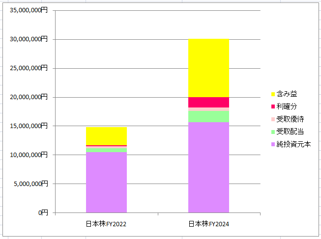 今年は累計の受取配当が194万円となり、日経平均株価も大きく上昇したことから資産も増加しています。日々精一杯工夫しながら「節約→投資」の両輪を回し続けて、気が付けば日本株の時価総額は2869万円に到達しました。なお、証券口座への投下資本のログの残し方に関しては長期株式投資さんのブログのログの残し方を参考にさせていただいています。