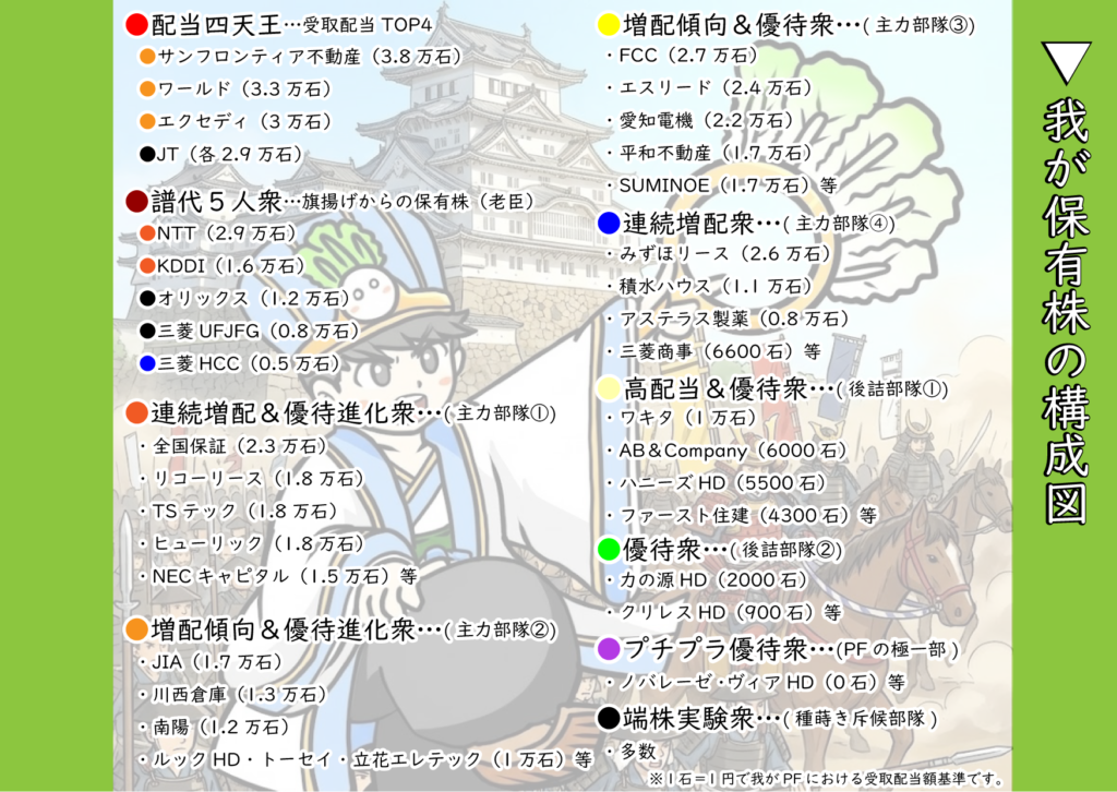 なお、株を保有するとその銘柄がポートフォリオという名の我が領地で一生懸命お仕事をして知行を増やしてくれます。例えば我が領地で現在最大知行を誇るサンフロンティア不動産は増配により前年から石高を3.3万石(円)→3.8万石(円)に増やしてくれています。なるべくお仕事を頑張ってくれそうな銘柄を仲間にして領地を増やしていきたいですね。なお、実験的な端株を含めると銘柄数が多くなりすぎるので「端株実験衆」は基本的にはこの中には含めておりません。