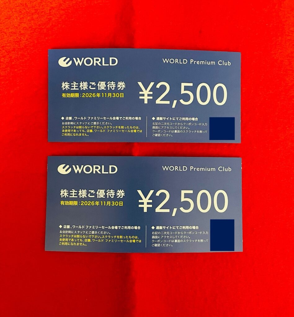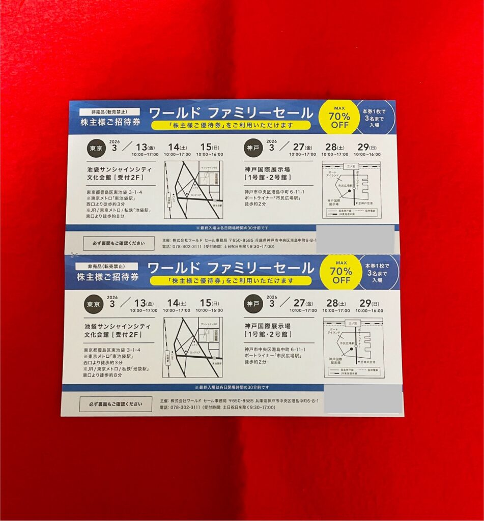 ワールドの株を300株以上、6カ月以上保有していると株主優待として「ワールドファミリーセール(株主様ご招待券)」「ご優待券(5,000円相当)」がもらえます。最大80%オフということなので相方の要望があるようであれば行ってみたいと思います。
