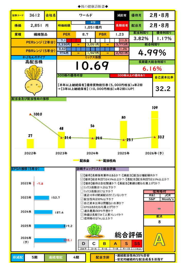 以上、今回は証券コード【3612】のワールドの株主優待の紹介でした。少しでもみなさまの参考になれば幸いです。