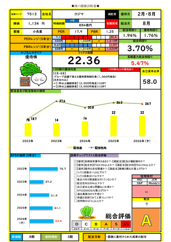 現在の優待と配当を合わせた総合利回りは「2.84%」と優待投資基準としてはやや物足りない水準に見えます。だがしかーし!2年以上保有していると総合利回りは「5.47%」と一気に魅力的な水準まで上昇します。しかもコジマは「寛容タイプ」の企業なので「石の上にも3年」、できれば2年以上を目指したいですね((“Q(・ω・*)♪
