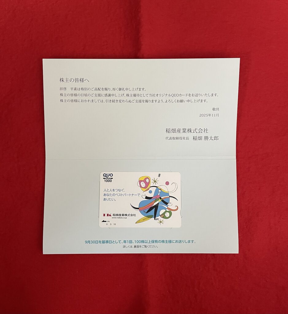 証券コード【8098】の稲畑産業からQUOカード(1,000円相当)が到着いたしました。