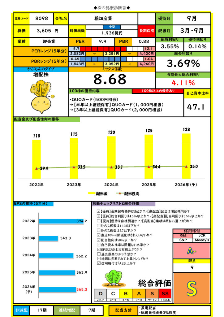 稲畑産業は自分のポートフォリオにおける卸売セクターの一角であり、配当は累進配当、株主優待も長く保有する程パワーアップしていく非常に魅力的なので個人的には引き続き保有しながら応援したい会社ですね((“Q(・ω・*)♪