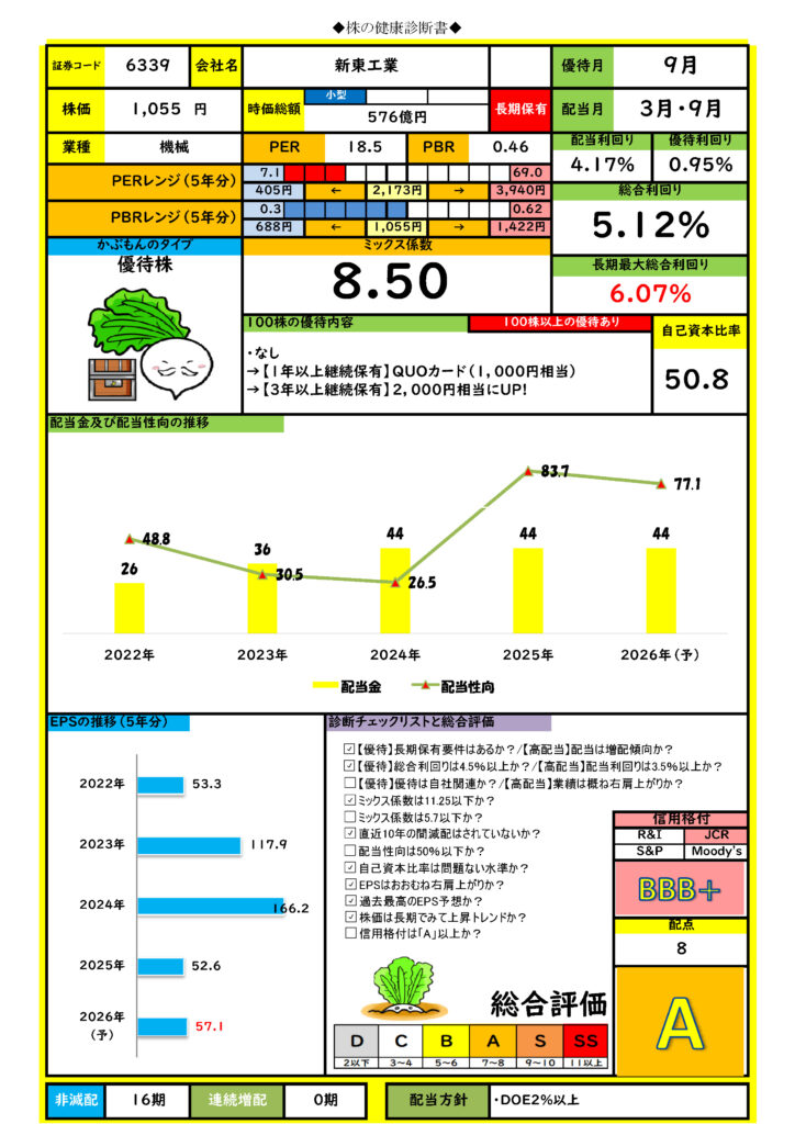 2025年12月9日時点の株価と株の健康診断書は以下となります。