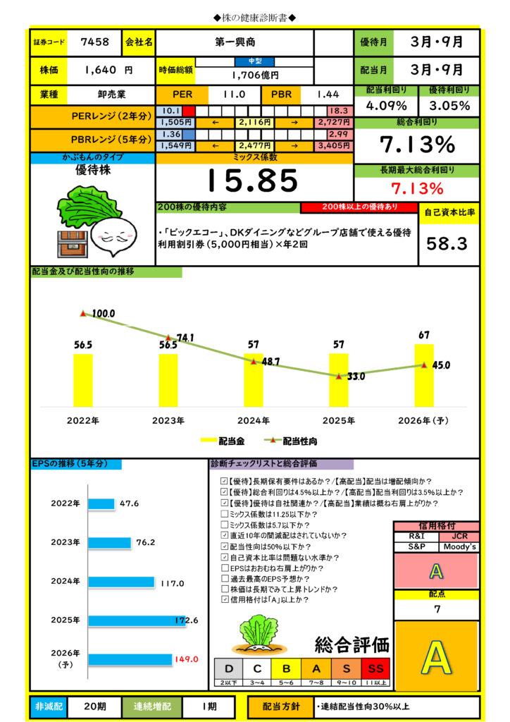 第一興商は取得単価1,529円に対する総合利回りも7%以上あり、優待も配当も年2回いただけます。自分のポートフォリオにおけるカラオケ・飲食関連セクターの一角であり、株主優待の内容も非常に魅力的なので家族で優待を楽しみながら応援したい会社ですね((“Q(・ω・*)♪