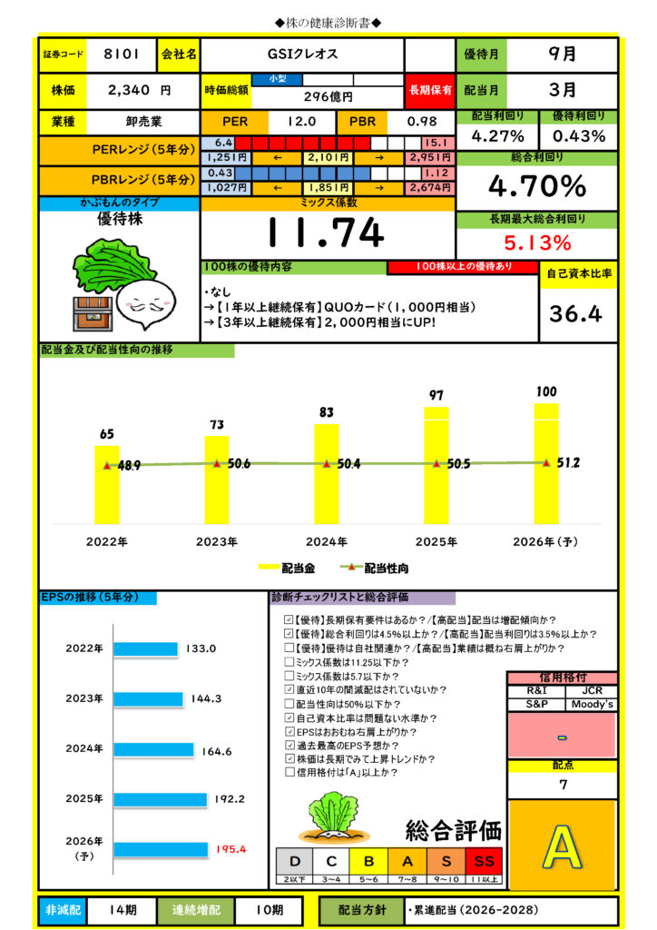 GSIクレオスは長期で持つと優待利回りもアップする銘柄であり、2023年4月に取得しており、取得単価ベースの総合利回りも6.63%まであがってきているので気長にゆっくり保有していきたいと思います。また自分のポートフォリオにおける卸売セクターの一角であり、長期保有付きの株主優待の内容や増配傾向の配当、株主還元姿勢も魅力的な企業なので引き続き応援したい会社です((“Q(・ω・*)