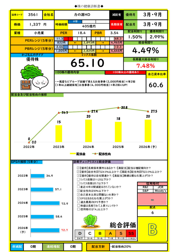 ミックス係数は65.10倍台と超割高水準でありますが、飲食系銘柄ではご愛敬と言ったところですね。過去5年のPER・PBRレンジからみた指標面では株価の割安水準と言う感じですね。なお、レンジ幅がかなり広くミックス係数が超割高なのは飲食系銘柄全体に言えるものになるので最少単元の投資なのでそこまで気にしていません。こちらは主力の増配傾向+優待株投資の枠ではなく、サテライトの優待族ワクワク投資枠での投資なので半年ごとにラーメンを食べるという緩い感じで保有していく予定です。(他にもクリレス等、PFの5%程度を目安にこういう優待メインの銘柄にも分散投資しています。)